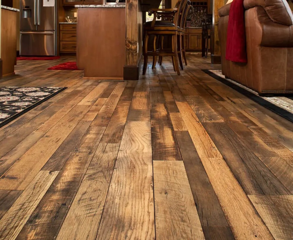 Description: Made from wood that has been salvaged from existing structures, like old barns, factories, or homes, and repurposed for new flooring. Pros: