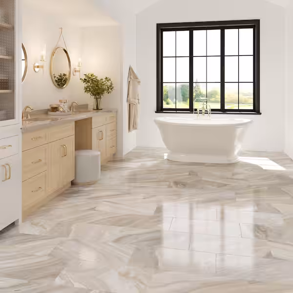 Description: A cost-effective, flexible flooring tile several layers of synthic and engineered layers that mimics the appearance of natural wood or tile Pros: