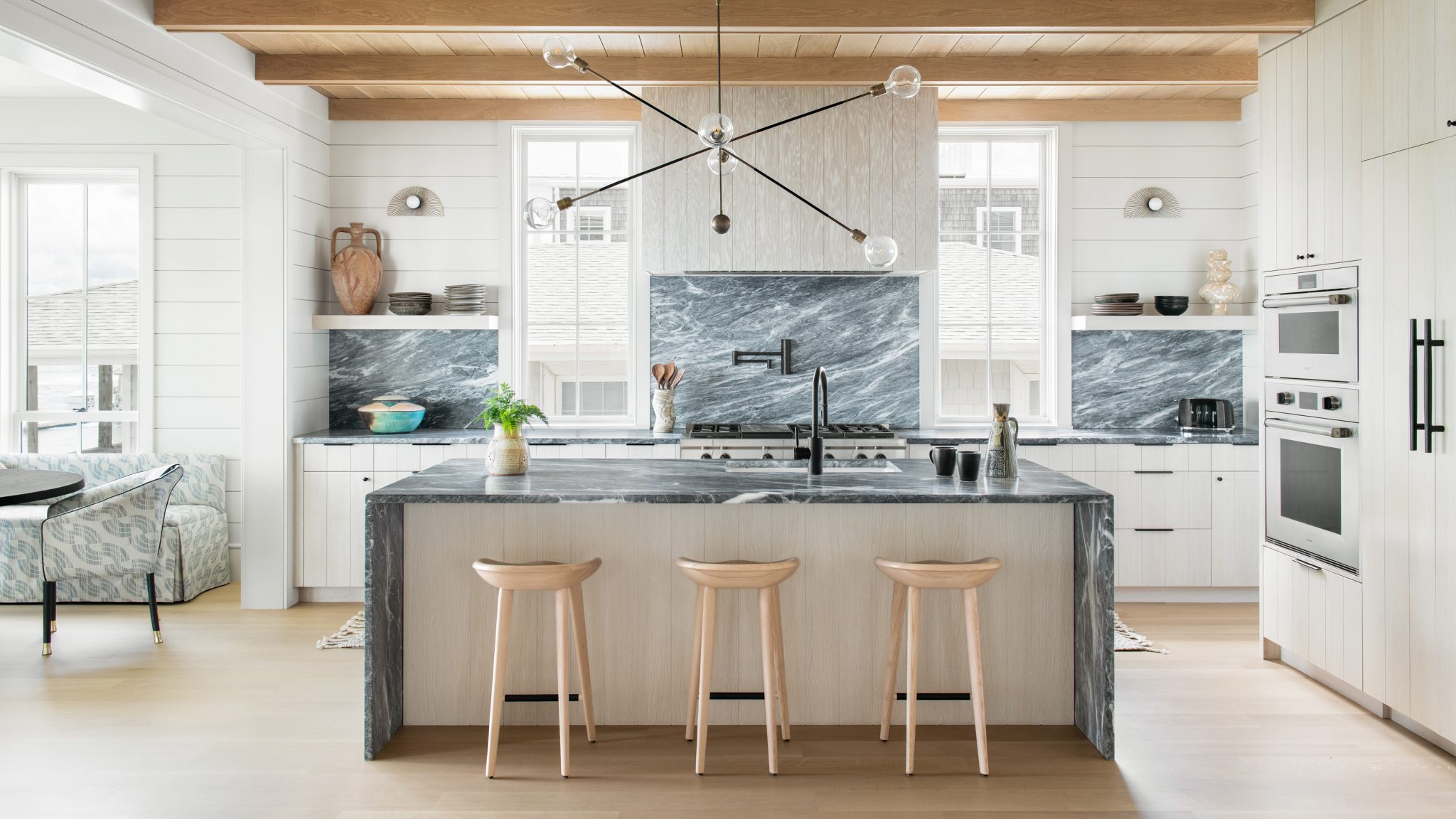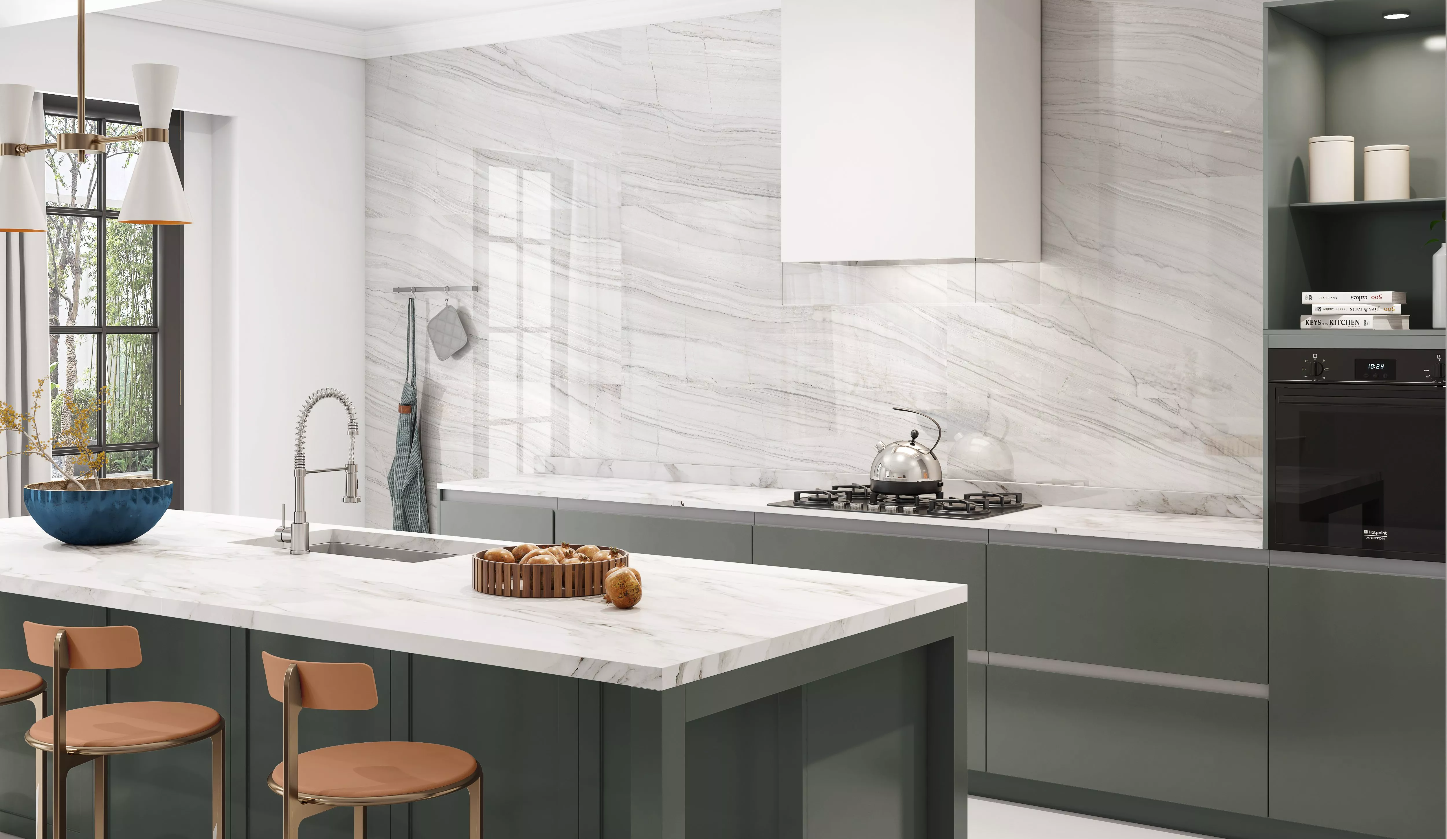 Continuous Stone Backsplash A continuous stone backsplash features seamless slab, that matches the countertop for a sophisticated, monolithic look. To enhanse the conhesive look, we carefully cut each slab and align the veins of stone. Crafted from luxurious materials like marble, granite, or quartzite, these designs are timeless and high-end. |
