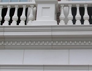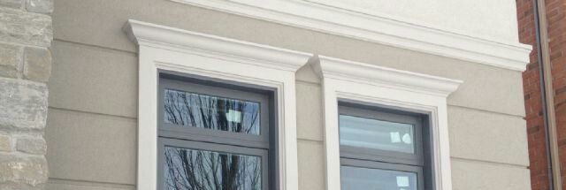Cornice trim is a decorative molding that runs horizontally along the top of a wall, similar to corwn moulding, but typically outside a building.